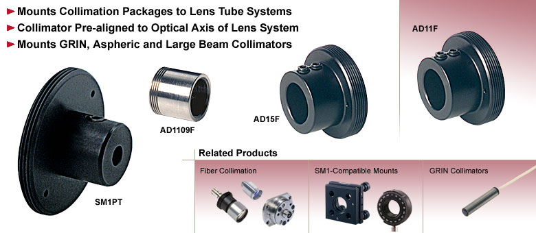 AD系列准直器适配器专为固定我们的非球面透镜准直器以及我们的大光束准直器而设计。AD系列适配器适用于外径为11毫米、12毫米或15毫米的准直器。准直器通过两个紧定螺钉固定到位。此外,所有适配器均配备内螺纹,可轻松安装我们的非球面透镜准直器,只需将准直器旋入即可。所有适配器的设计均确保准直器与透镜系统的光轴对齐。