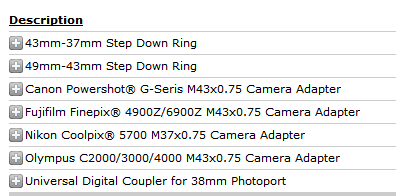注意:其他品牌和型号也可能兼容。通用数字耦合器采用M37x0.75公螺纹安装。请向您的相机制造商或经销商咨询适用于您特定相机的适配器列表。上述所有相机均未经过测试,在较低变焦设置下可能会出现明显的暗角现象。