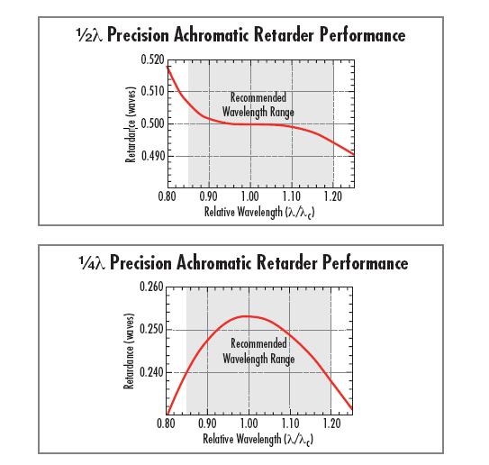 这些精密延迟器采用精心对准的双折射聚合物片材,层压于精密N-BK7窗口之间。提供标准1/4波长和1/2波长选项,适用于可见光和近红外区域的常见波长范围。聚合物延迟器具有出色的视角特性,因为它们是真正的零级延迟器。在±10°入射角范围内,这些延迟器的延迟变化将小于1%。与任何其他双折射延迟器相比,聚合物消色差延迟器的延迟随波长的变化要小得多。