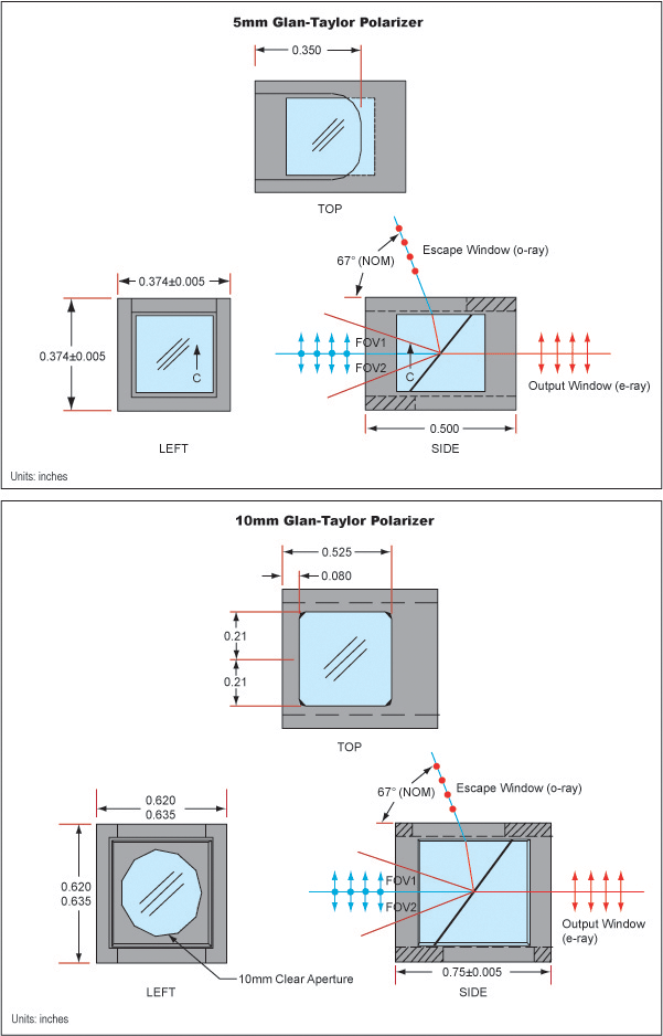 针对市场对我们Glan-Thompson偏振器的高需求,我们现推出Glan-Taylor和Glan-Laser偏振器。这些偏振器具有与标准级Glan-Thompson偏振器相同的高消光比,并额外具备以下特点:无论是寻常光(P偏振)还是非常光(S偏振),两种光线均可被利用。其中,非常光透过两个棱镜传输,而寻常光则经由斜面反射后从出射窗透出(通常为正入射光束时23°的出射角),使该元件可用作偏振分束器。每个偏振器均由两个安装于空气间隙中的方解石棱镜组成,可提供未镀膜或带宽广抗反射涂层两种选择。损伤极限为标称值,具体数值可能因天然方解石晶体的材料特性而有所不同。
