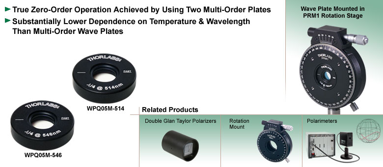 Thorlabs的零级波片由两块多级石英波片组合而成,这两块波片的光程差分别为λ/4或λ/2。通过将其中一块波片的快轴与另一块波片的慢轴对齐,最终得到的复合延迟器的总延迟量等于每块波片各自延迟量之差。复合零级波片对温度和波长的依赖性远低于多级波片。这些零级波片的结构是在两块多级波片之间放置一个蚀刻过的不锈钢间隔环,然后用环氧树脂将整个组件封装在直径1英寸的阳极氧化铝外壳中。仅在清晰孔径外侧涂覆环氧树脂,以防止损伤阈值降低。波片外壳上刻有一条线,用于指示波片快轴的取向,并标注有文字说明该波片是λ/4还是λ/2波片,以及该波片所针对的波长。零级波片的典型厚度约为2毫米,但不同产品之间可能存在差异。如需了解更多关于波片使用与选型的信息,请查看我们的选型指南选项卡。此外,Thorlabs还提供消色差波片, 电信零级波片, 、单色多级波片, 、双波长多级波片以及全系列偏振光学元件。