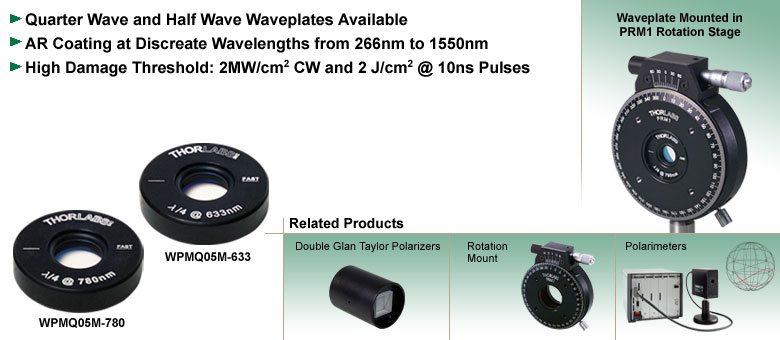 我们的波片安装在1英寸外壳中,外壳正面面板上以一条直线清晰地标出了波片的主平面。可提供λ/2型,用于旋转偏振方向;也可提供λ/4型,用于将线性偏振光转换为圆偏振光,反之亦然。除了多级波片,Thorlabs还提供消色差波片, 电信零级波片, 、, 零级波片、双波长多级波片以及全系列偏振光学元件。