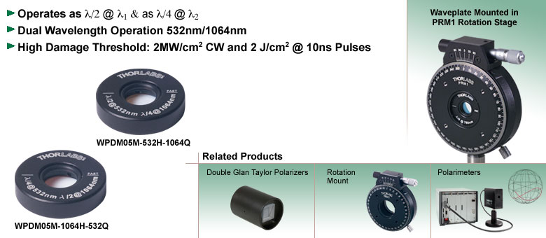 Thorlabs双波长多级波片采用高品质结晶石英制成,可提供四分之一波片或半波片延迟。这些波片专为双波长应用(1064nm和532nm)而设计,在一种波长下用作四分之一波片,而在另一种波长下则用作半波片。提供两种型号:λ/4@532nm;λ/2@1064nm,以及λ/4@1064nm;λ/2@532nm。