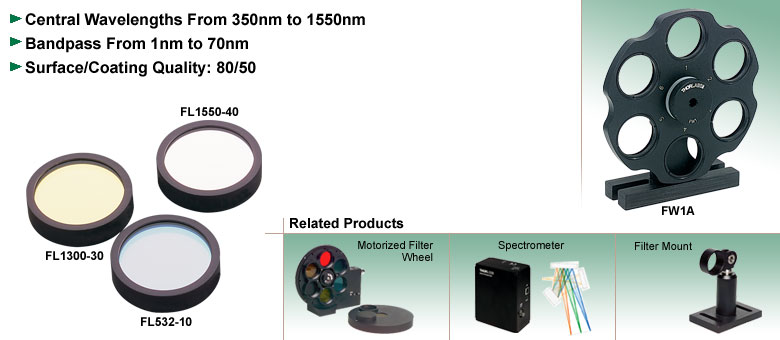 Thorlabs的带通滤光片提供了一种最简单、最经济的途径,用于传输波长范围明确的光,同时有效抑制其他不需要的辐射。该滤光片的设计本质上是一种采用真空沉积技术制成的薄膜法布里-珀罗干涉仪,由两组反射堆叠结构构成,中间以偶数层间隔层隔开。 这些反射堆栈由高、低折射率材料交替构成,其反射率有时可超过99.99%。通过改变间隔层的厚度和/或反射层的数量,可以调整滤光片的中心波长和带宽。这种滤波器在通带内的透射率非常高,但带外阻断范围有限。为了弥补这一不足,会额外增加一个阻断元件,该元件根据所需的阻断范围,可采用全介质结构或金属-介质结构。此额外的阻断组件将消除任何不需要的带外辐射,但也会降低滤波器的整体传输吞吐量。 采用这些方法,Thorlabs能够提供从340纳米到1650纳米的多种带通滤光片。此外,Thorlabs还可为定制带通滤光片提供两到四周的交货周期;