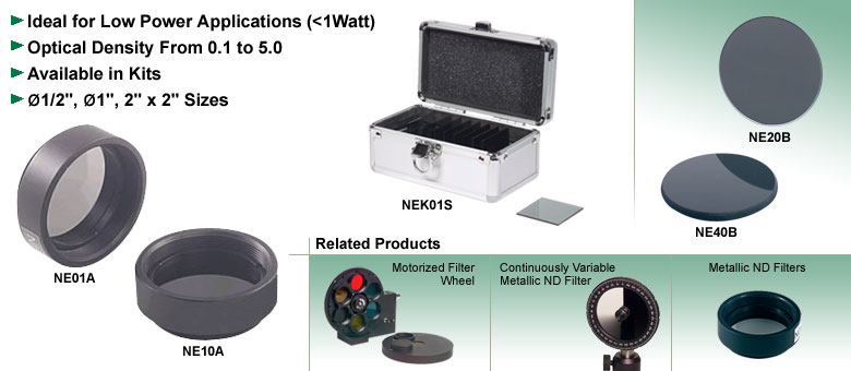 Thorlabs的Ø1英寸和2英寸×2英寸吸收式中性密度滤光片也提供滤光片套件。每个套件包含以下光学密度的1片滤光片:4.0、3.0、2.0、1.0、0.6、0.5、0.4、0.3、0.2和0.1。