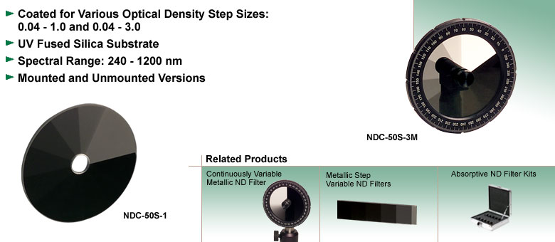 Thorlabs圆形阶梯式可变金属中性密度(ND)滤光片可通过旋转实现8级或10级的光学密度调节。这些滤光片采用紫外熔融石英玻璃基底,并镀有金属(因科镍合金)涂层。因科镍薄膜是一种硬度极高的金属合金,在正常条件下具有优异的抗老化性能。然而,因科镍涂层在高温下会氧化;因此,建议将金属ND滤光片用于低于100°C的温度环境中。采用因科镍涂层可确保这些ND滤光片从紫外到中红外波段的光谱响应极为平坦。
