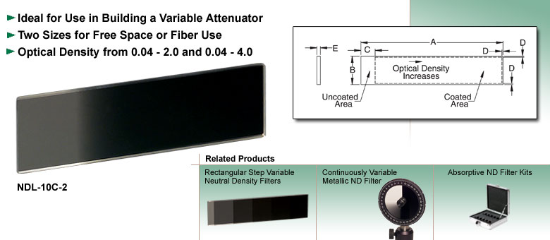 Thorlabs矩形连续可变金属中性密度(ND)滤光片非常适合安装在位移台上,用作可变衰减器。我们提供两种不同版本,均具有10毫米和25毫米两种高度尺寸,其光学密度范围从0.04(未镀膜材料)到2.0,或从0.04到4.0。