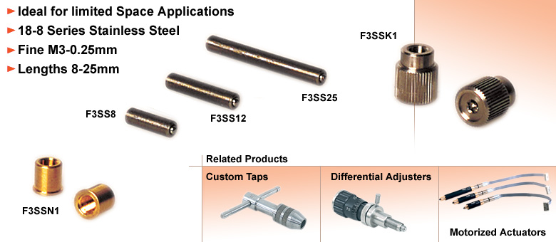 F3SS系列六角调节螺钉非常适合空间受限且需要精细(250μm/转)分辨率的应用场合。采用250μm螺距的螺钉,螺纹深度仅为125μm。我们开发了特殊的制造工艺,确保每件产品都达到极其严格的公差要求(优于3级精度)。