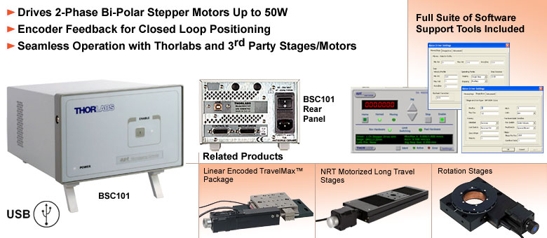 BSC100系列apt™控制器是一系列单通道、双通道和三通道50瓦步进电机控制器,专为驱动大功率、两相双极步进电机而设计,支持带或不带编码器反馈的电机。该控制器旨在驱动Thorlabs提供的高功率步进电机配套的纳米定位执行器和平台(详见相关商品选项卡),或者,也可选用各种功率和不同步距角的通用两相双极电机,使该设备具有极高的灵活性——我们提供一根分线电缆,以支持后一种选择。