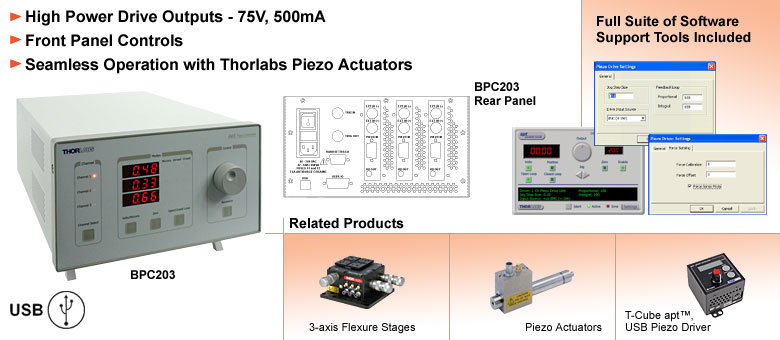 BPC200系列压电控制器是一系列适用于台式应用的apt™单通道、双通道和三通道高功率(75 V,500 mA)压电控制器,可用于开环和闭环纳米级位置控制。它们专为驱动Thorlabs提供的全系列配备开环和闭环压电的纳米定位执行器与平台而设计(详见相关产品选项卡)。此外,灵活的软件设置使这些单元具有高度可配置性,因此非常适合驱动第三方产品中的各种压电元件。波形生成功能搭配触发输出,使该单元特别适用于压电扫描应用。