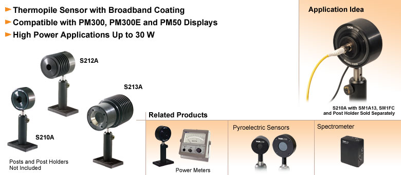 热传感器 S200系列热传感器探头为最高30瓦的连续波光功率测量提供了理想的解决方案。它们基于带有宽频涂层的热电堆传感器。这些功率计专为自由空间应用中的通用高功率连续波光学测量而设计。