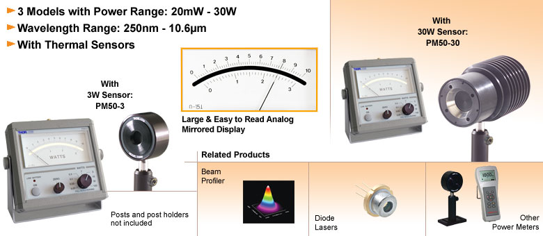 功率范围:20毫瓦 - 3瓦(PM50-3),20毫瓦 - 10瓦(PM50-10)或100毫瓦 - 30瓦(PM50-30);