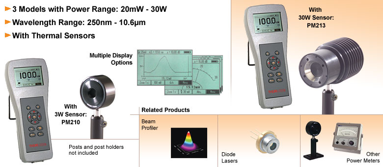 功率范围:20毫瓦 - 3瓦(PM210),20毫瓦 - 10瓦(PM212),或100毫瓦 - 30瓦(PM213);