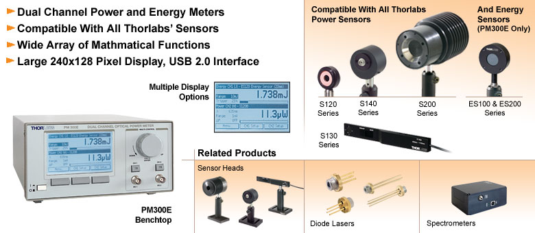 PM300兼容所有Thorlabs S100系列光电二极管传感器(双通道)和S200系列热传感器(单通道),并可连接最大光电流达10mA的未放大阳极或阴极接地光电二极管,以及输出电压最高达100mV的热元件。该PM300E还提供使用所有Thorlabs ES100和ES200系列能量传感器(两个通道)进行能量测量的功能,以及使用S200系列热传感器进行双通道测量的功能。PM300和PM300E系列均作为单台台式设备销售,传感器需另行订购。该设备可与我们任意一款功率计传感器头或用户自备的光电二极管配合使用,后者须能提供最高10毫安的输出电流。此外,PM300E系列还兼容所有ES100和ES200系列热释电能量传感器。