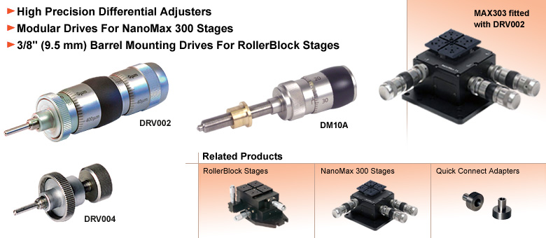 DRV004 螺母驱动器可直接与任何模块化快接组件兼容。配合模块化快接适配器使用时,它还可安装于配备标准3/8英寸(9.5毫米)安装夹的组件上。大直径滚花旋钮灵敏度极佳,在8毫米调节范围内分辨率优于1微米。