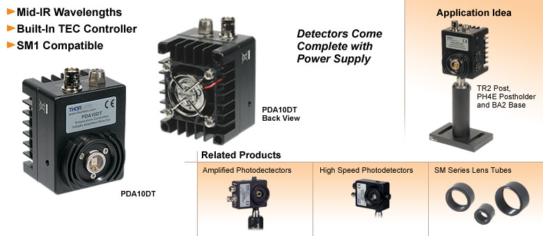 PDA10DT 是Thorlabs PDA系列探测器的扩展型号,采用扩展范围InGaAs探测器,工作波长位于中红外区域(1.2 - 2.6µm)。该探测器内置温度控制器,可将温度稳定在-10 °C。 探测器的暗电流对温度敏感;因此,通过冷却并稳定探测器,可显著降低与环境温度范围相关的暗电流和噪声,从而实现更高的增益和更低的直流偏移。