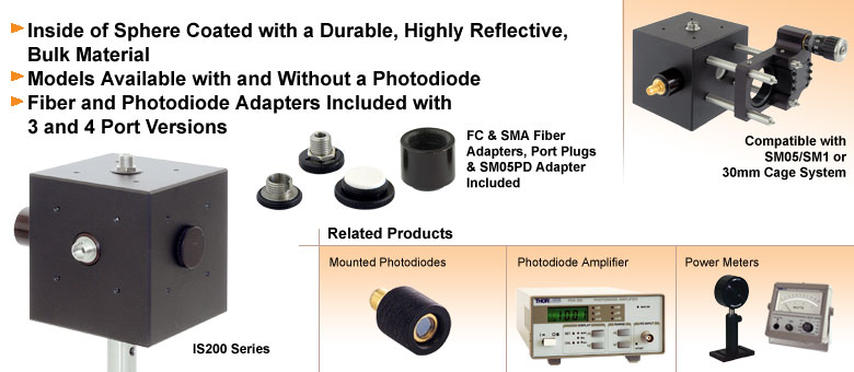 我们的IS200积分球可配备安装式硅光电二极管(350-1100nm)、安装式InGaAs光电二极管(800-1700nm),或不配备探测器。若购买不带内置探测器的积分球,其工作波长范围受限于250至2500纳米的反射率波长范围。购买不带探测器的球体时,可使用带有SM05螺纹的3毫米探测器接口安装我们任意一款SM05PD探测器。