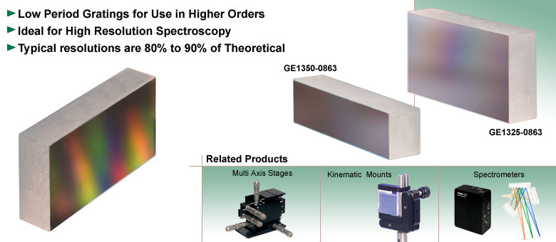 高分辨率 echelle 光栅是专为高衍射级次设计的低周期光栅。它们通常与第二块光栅或棱镜配合使用,以分离重叠的衍射级次。Echelle 光栅采用精密玻璃基底制造,其分辨率可达理论值的 80% 至 90%。Thorlabs 提供一系列高分辨率 echelle 光栅,这些光栅具有较高的闪耀角,是高分辨率光谱分析的理想之选。