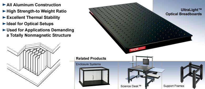 超轻™光学面包板提供高强度重量比和优异的热稳定性。这些面包板是理想的光学设置在便携性和动态刚度是重要的。它们通常用作铝,钢或花岗岩表面板的替代品,以及要求完全非磁性表面的应用。
