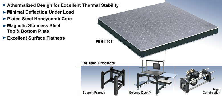Thorlabs提供两个级别的刚度: 高和增强。虽然与面包板的厚度密切相关,但刚度的差异转化为负载下的不同挠度。刚度越高,则当负载或力施加到面包板时面包板抵抗弯曲的能力越好。因此,当在面包板的中心放置重负载时,与增强刚度面包板相比,高刚度面包板将弯曲得更多。该弯曲在面包板的不同端部上的两个部件之间产生偏转。例如,当进行需要在面包板上滑动光学装置同时保持直的光轴的实验时,该特征尤其重要。例如,当在PBH11107的中心放置100kg的负载时 (a性能™4'x2' 高刚度,标准阻尼,面包板,2.4“厚),面包板将弯曲11µm,即面包板将具有抛物线形状,中心比边缘低11 µ m。A PBH12107 (a性能™4'x2' 增强刚度,标准阻尼,面包板,4.3 “厚) 在同一示例中,假设抛物线形状相当小,则仅偏转3 µ m。