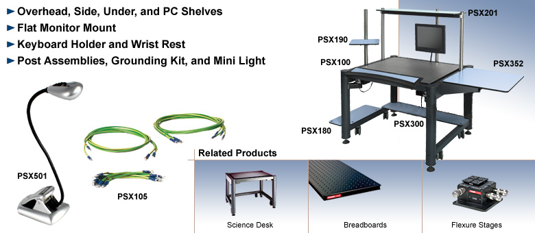 Thorlabs ScienceDesk系列工作站的配件可提供多种定制配置,几乎满足任何工作空间需求。备有多款搁板可供选择,包括顶置搁板、侧置搁板和下置搁板,以支持测试仪器、电脑和工具的摆放。所有搁板均采用防静电材料制成。显示器支架可将标准平板显示器悬空放置于工作台面上方。此外,还提供键盘支架和腕托,以进一步提升人体工学工作环境。接地套件使ScienceDesk工作站成为处理敏感应用的理想之选。