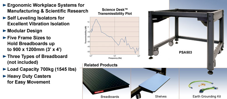 该系统提供五种标准尺寸的工作台面,尺寸范围从2.5英尺×2.5英尺(750毫米×750毫米)到3英尺×4英尺(900毫米×1200毫米),所有工作台面均采用标准桌面高度30.1英寸(765毫米)。ScienceDesk 框架采用轻质全铝材质,配备重型可旋转脚轮,便于移动。框架提供两种级别的减振功能:主动自调平(本页面)和被动式。还提供一种刚性非隔振支撑系统,该系统不具备隔振功能。这些框架专为兼容我们三种面包板系列的面包板而设计——即Ultralight™, Performance™,以及PerformancePlus™——可灵活打造具备多种隔振方案的工作空间。我们提供种类齐全的配件,助您设计个性化的工作站,包括搁板选项、键盘托架、显示器支架、接地套件等。其中,搁板配件均符合ESD标准。除了标准配件外,Thorlabs还提供定制配件,例如法拉第笼和家具模块。