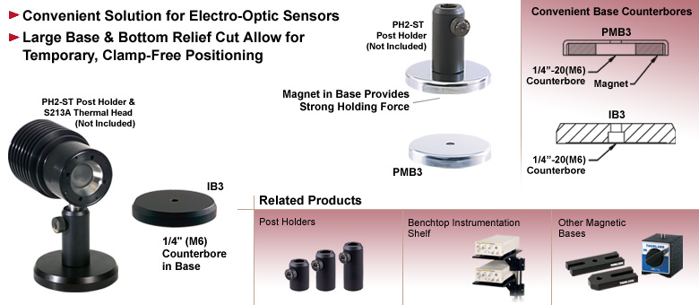 我们的仪器底座提供了一种便捷的方式,可将仪器或光学传感器(如光电探测器)临时定位到光机电组件中。这些底座基本上消除了将底座牢固固定在光学平台上的必要性。此外,该底座提供了更大的位置灵活性,因为它无需与光学平台上标准的孔位图案对齐。从装置中取下安装座后,只需将其放置在光学平台的其他位置或附近的架子上即可,无需额外的搬运或存储防护措施。