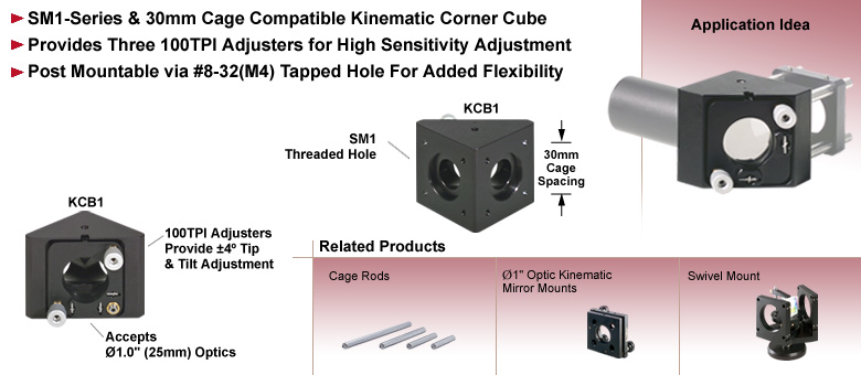 KBC1立方体可对安装在安装板上的光学元件进行平移和倾斜运动,该安装板的平均水平位置呈45º角。入口和出口端均配备一个SM1(1.035英寸-40)中心螺纹孔,以及四个#4-40螺纹孔,孔心间距符合我们30毫米笼式系统标准。运动学倾斜和俯仰调节板的平均水平方向为45º,采用100 TPI(每英寸螺纹数)调节螺钉进行驱动,以实现平稳且高灵敏度的运动。