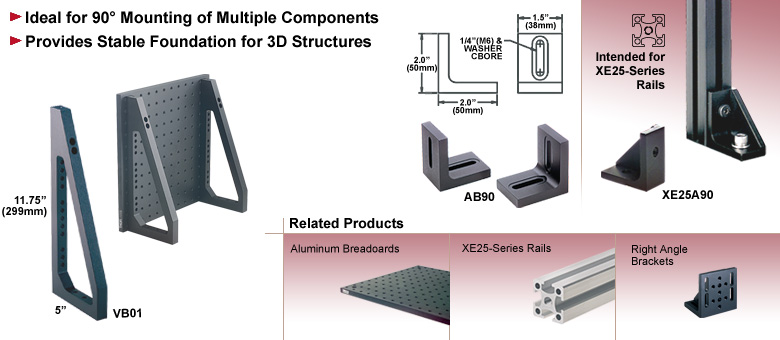 这些直角结构支架专为构建需要垂直安装和/或直角支撑的刚性三维光机电组件而设计。支架尺寸从小型的XE25A90开始,该型号专为垂直安装我们的XE25系列导轨和面包板外壳而设计,到大型的VB01,该型号专为垂直安装铝制面包板而设计。坚固的一体式结构提供了卓越的刚性。