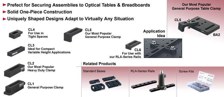 CL系列台式夹具广泛应用于复杂光机电组件的组装。它们能够适应各种异形及不同安装孔位,是节省时间的不可或缺之选。所有夹具均需搭配1/4英寸-20(M6)螺帽螺丝,此外还常配有垫圈,这些配件均随附于我们便捷的螺钉套件中。
