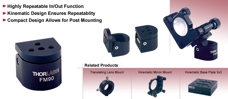 FM90非常适合需要将激光束重新定向以用于诊断或光束共享的应用。其铰链设计可使光学安装座移至光束路径之外,必要时只需简单翻转,即可将其重新定位回原始位置。