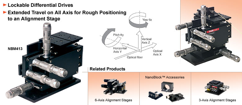 此5轴设备平台专为与NanoMax™ 600六轴波导操纵器配合使用而设计。它非常适合需要将光学元件或组件固定于高性能多轴对准系统前方特定位置的应用场景。该设备提供的五个自由度可使光学组件的固定部分定位至相对于另一定位台具有恰当朝向的位置。朝向调整通过5个微调装置实现。粗调由螺距为0.5毫米的丝杠驱动,精调则采用我们专利的差动机构,每转可实现50微米的平移,调节范围达300微米。
