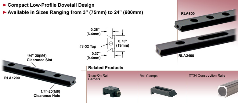 RLA系列光学导轨的所有表面均经过精密加工,以确保卡扣式载物台在沿导轨长度移动时保持良好的侧向对齐。该导轨采用燕尾槽轮廓设计,配合卡扣式载物台的结构,可轻松地将光学元件插入或取出现有的导轨系统(参见右侧图片)。
