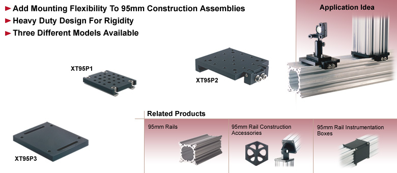 XT95P3 光学台底板XT95P3主要用于使用XT95导轨构建刚性三维结构。该板通过四个M6沉头孔固定在XT95导轨的开放端上。随后,可利用两个M6间隙槽将整个组件固定到如右侧所示的光学平台上。