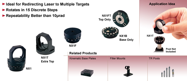 这些光学安装座非常适合将激光重新导向光学工作台上的多个目标。应用包括:精确切换共享激光系统、将光信号引导至多个测试仪器,以及轻松更换光学元件(配备额外的NX1T顶部安装座)。为获得最佳性能,请确保NX1牢固地固定在其支撑结构上。提供一组三个#8-32(M4-0.7)安装孔,适用于非立柱式安装应用。底座上的侧孔可插入球形驱动器,以便将底座固定到标准帖子。