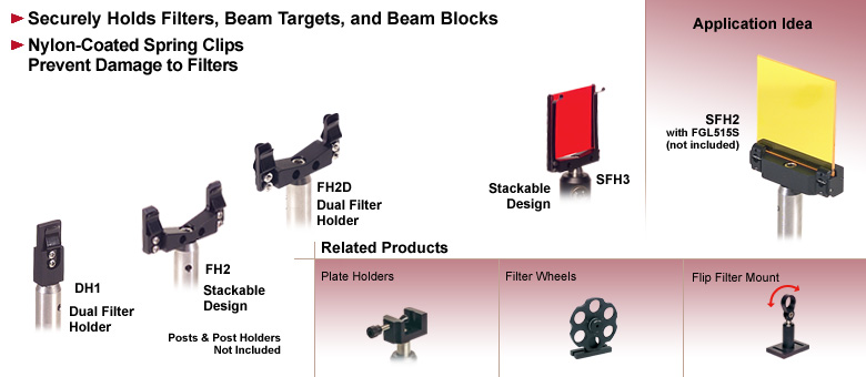 紧凑型滤镜支架:DH1、FH2、FH2D我们经典的紧凑型滤光片支架是实现多种省时功能的理想工具,尤其适用于新光学机械组件的搭建过程。这些支架通常与简单的索引卡或红外观察卡配合使用,非常适合作为临时光束挡板或光束靶标。此外,它们坚固耐用,足以在组件中长期使用,特别适合用于固定中性密度滤光片和色差滤光片。