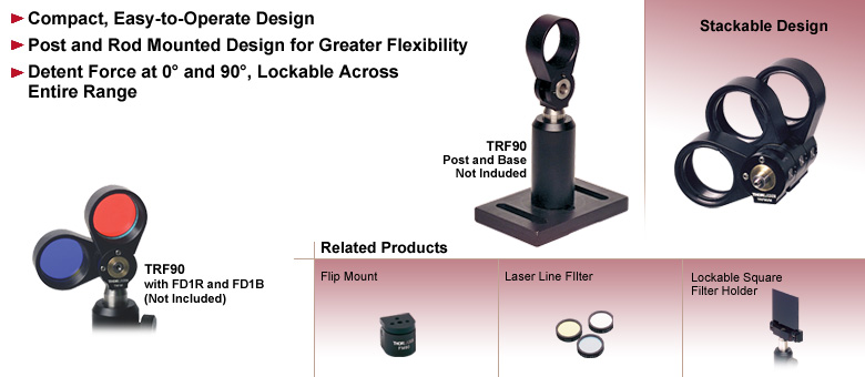 TRF90滤光片安装座采用紧凑、易于操作的设计,兼具多功能性。TRF90可单独安装于支架上,也可安装于ER杆上,以实现滤光片的串联堆叠。由于该滤光片安装座的深度仅为0.5英寸(13毫米),因此在搭建滤光片堆叠时,所需ER杆的最小长度等于所堆叠滤光片安装座的数量乘以0.5英寸(13毫米)。精密卡扣机构可在0°和90°位置提供牢固的固定力,而尼龙紧定螺钉则可确保安装座锁定到位。