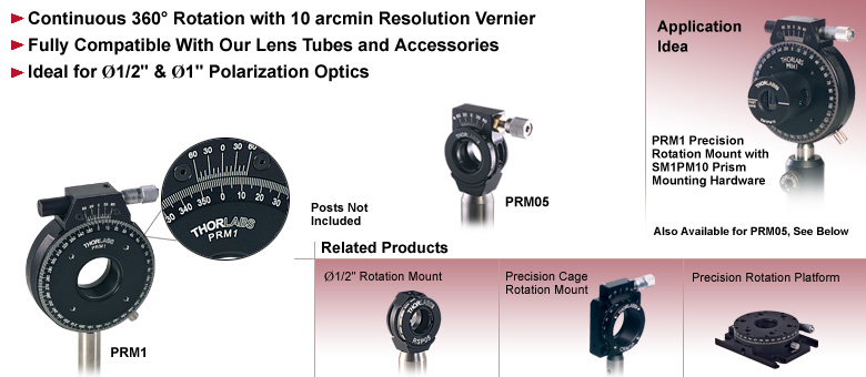 PRM05非常适合安装我们的SM05PM5 偏振棱镜座。SM05PM5 通过我们标准的 SM05 系列螺纹固定在 PRM05 上。其旋转盖可让使用者在不需要时遮挡两个侧端口。我们的PRM05GL5结合了SM05PM5和PRM05,可为我们的GL5和GT5偏振棱镜(需另购)提供360°的高精度旋转功能。PRM05和PRM05GL5也提供公制版本。