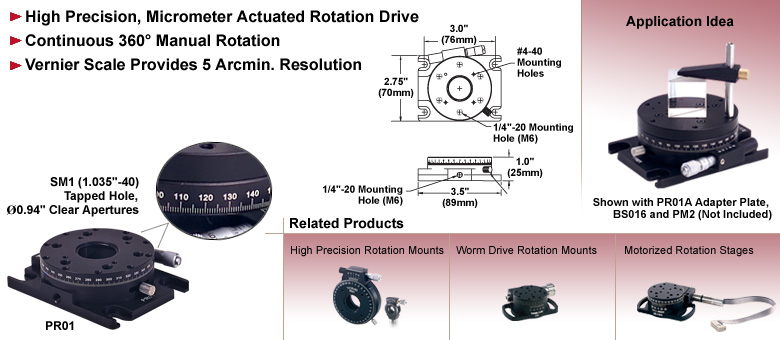 PR01精密旋转平台结合了操作简便的手动旋转功能与高精度、无间隙的微米级调节装置。当平台刻度盘处于解锁状态时,可通过1°刻度标记实现连续平稳的旋转测量。通过上方图片中可见的钢制拇指螺钉将其锁定后,刻度盘将由±7°的微米驱动系统进行调节,侧向游标可提供5角分的分辨率。若需更高角度分辨率,还可利用游标对微米头刻度进行校准,使分辨率低至1角分,在±5°范围内实现优于1%的精度。