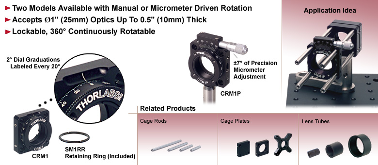 CRM1提供一个可锁定的360°连续旋转光学座,该座安装于30毫米笼板内。旋转刻度盘以2°为增量进行刻度,并每隔20°标注一次。位于顶部的参考线蚀刻于倾斜表面上,以最大限度地扩大其观察角度。SM1(1.035英寸-40)螺纹座可直接安装直径1英寸(25毫米)、厚度不超过10毫米的光学元件,并通过一个SM1RR固定环(见下方)。