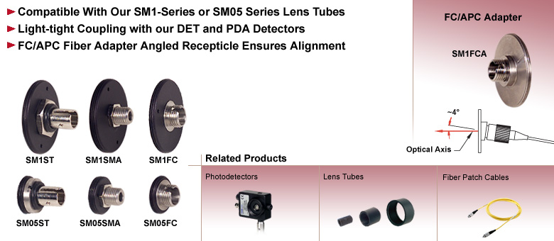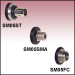 Thorlabs的SM系列光纤适配器可将FC、SMA和ST连接器的光纤与我们的SM05和SM1系列透镜套筒及安装座集成。