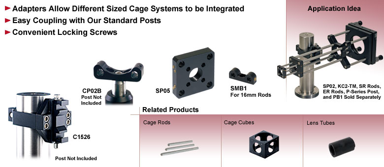 SP05可将我们的16毫米笼式系统与30毫米笼式系统集成。为固定由16毫米和30毫米笼式系统组装而成的光学平台,Thorlabs分别提供SMB1和CP02B,它们均配备三个沉头#8-32(M4)安装孔,可与我们的标准支柱配合使用。此外,Thorlabs还提供C1526,该产品可将30mm笼式系统适配至我们的Ø1.5英寸P系列支柱,以增强刚性。