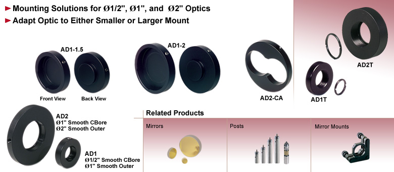 Thorlabs提供这些多功能安装座,可轻松适配各种光学元件直径标准。从Ø1/2英寸至Ø1英寸的转接件,以及Ø1英寸至Ø2英寸的转接件,几乎任何标准尺寸的光学元件都能适配到更大尺寸的光机械安装座或固定滤光片安装座。