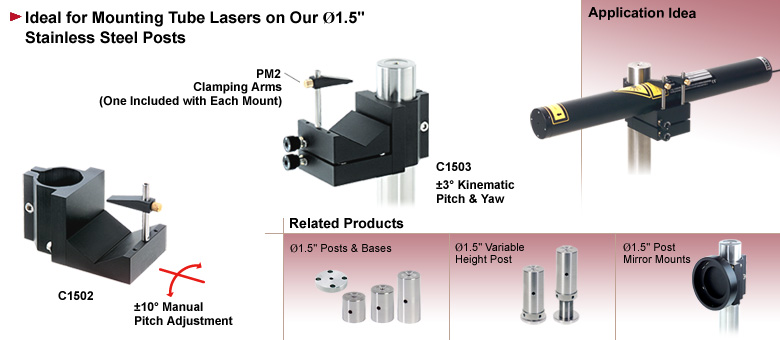 C1502和C1503后置V型夹具安装座专为将HeNe激光器等圆柱形物体固定到我们坚固的Ø1.5英寸P系列立柱而设计。每个V型夹具与一个PM2夹紧臂(每台设备均配有一只)配合使用时,可稳固地夹持直径介于Ø0.56英寸(14毫米)至Ø2英寸(50毫米)的圆柱形物体。