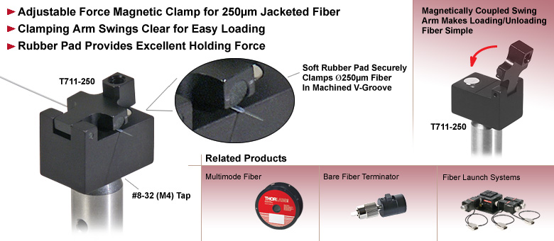 这种通用光纤夹具为将玻璃或塑料光纤轻松集成到光机电实验台或光学平台组件中提供了便捷途径。其精密V形槽和橡胶垫专为夹持单模或多模光纤的护套而设计,不会对其造成任何损伤。主体安装体内的磁铁与摆动臂中的磁性钢制紧定螺钉相结合,可实现夹紧力的动态调节。将磁性紧定螺钉向主体磁铁方向移动,可增大夹紧力;反之,将紧定螺钉远离磁铁,则可减小夹紧力。本产品常与我们的一款热门产品搭配使用。非球面透镜用作光纤输出准直器时,可实现接近衍射极限的性能。