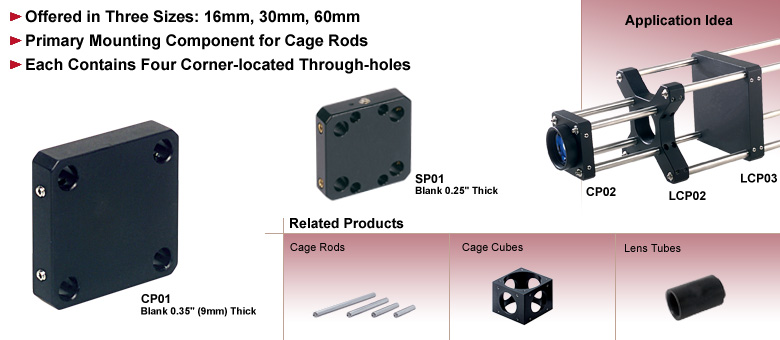 笼组件板是用于安装笼组件杆的主要固定部件。Thorlabs提供三种标准笼组件板,其标准由笼组件杆的中心距定义:16毫米、30毫米和60毫米笼系统板。这三种尺寸的笼组件板均有供应。