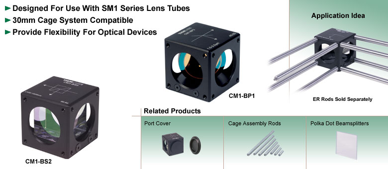 Thorlabs的CM1-BS和CM1-BP系列分束器为使用我们的30 mm笼式系统和透镜筒产品构建光学器件提供了更高的灵活性。这些安装式分束器可缩短原型制作、实验和生产的所需时间。这两个系列均可通过随附的螺纹安装适配器,安装在英制和公制支柱上。