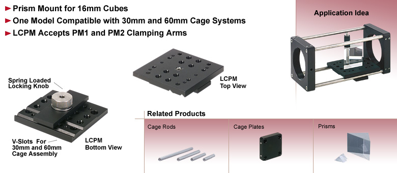 LCPM用作出色的通用笼式系统安装平台。其丰富的螺纹安装孔包括1/4英寸-20(M6)和8号-32(M4),可用于通用安装;此外,还有6号-32(M4),适用于PM1和PM2夹紧臂安装板的下表面设有两个V型槽,可兼容30毫米和60毫米笼式系统标准。一个由弹簧加载的拇指螺钉驱动的锁定板,可为配合的笼杆提供夹紧力,以实现稳固定位。