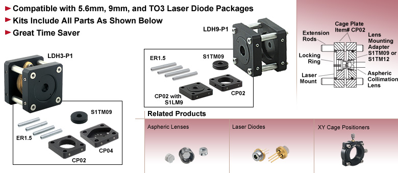 LDH9-P1准直组件专为配合直径5.6毫米至9毫米的小型激光组件而设计。如右上图所示,激光二极管安装在S1LM9内部,而S1LM9又安装于CP02之中。一个已安装的非球面透镜通过螺纹旋入S1TM09,随后S1TM09再旋入第二个CP02。整个系统通过精密的笼式组件杆实现中心对齐,从而可在光束传播轴上进行手动定位。部件包括CP02(×2)、ER1.5, S1TM09和S1LM9。