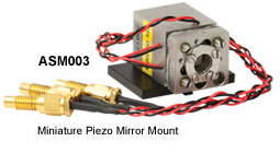 微型压电驱动柔性镜架 紧凑型压电控制的ASM003镜架采用柔性机构和一系列低电压压电元件,可确保优于1角秒的角分辨率。嵌入镜架外壳内的压电元件使这一高角分辨率成为可能。三个细螺距手动调节器(0.3毫米/转)可提供±2°的角向控制和1毫米(0.04英寸)的平移,并可同时使用以实现纯平移。当由我们的压电驱动器,压电元件的工作频率可达2 kHz,因此当需要快速扫描谐振腔长度时,这种反射镜支架是理想的激光腔反射镜固定装置。